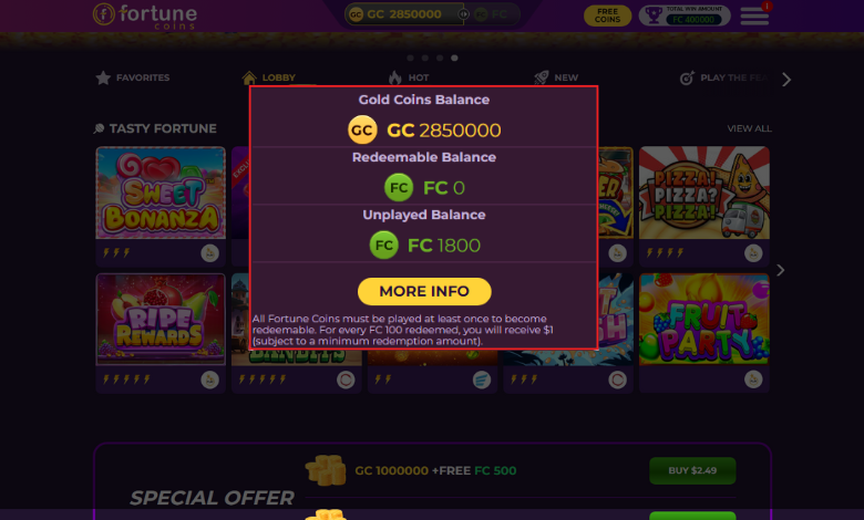 - Fortune Coins (FC): These coins are used in sweepstakes games and can be redeemed for cash prizes. Players must play with Fortune Coins at least once before they become redeemable, linking enjoyment directly with potential rewards.